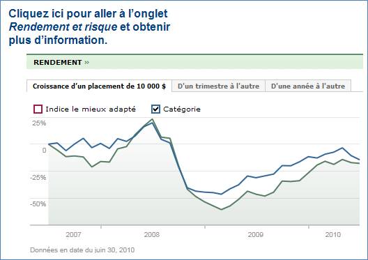 Le graphique Croissance d’un placement de 10,000 $ montre l’évolution d’un placement de 10,000 $ dans le fonds sur une période de trois ou de cinq ans. Vous pouvez également choisir de suivre le rendement de l’indice le mieux adapté (trait rouge) ou celui de la catégorie (trait bleu) à laquelle appartient le fonds.