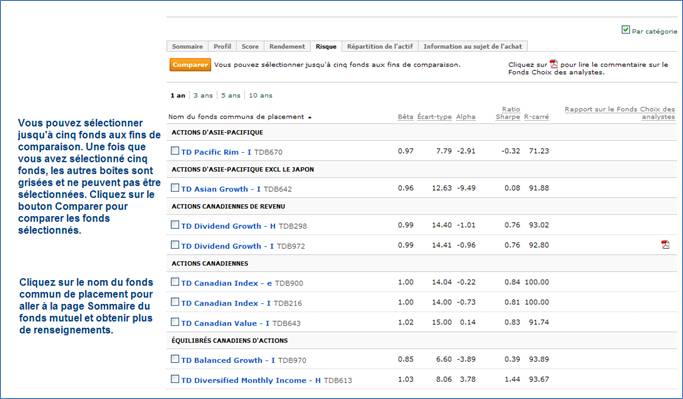 L'onglet Risque fournit les renseignements suivants au sujet des risques associés à chaque fonds commun de placement sur une période de 1 an, 3 ans, 5 ans ou 10 ans.